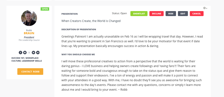 Patreon made use of a range of vetting tools on the SpeakerHub platform, specially designed for event organizers.