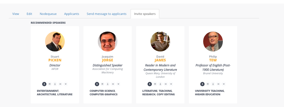 If you have a few speakers who you think might be the right fit, you can invite them to apply for your event by hitting the “invite” tab. We even go the extra mile by suggesting speakers we think might be a good fit, based on the topic of your event.