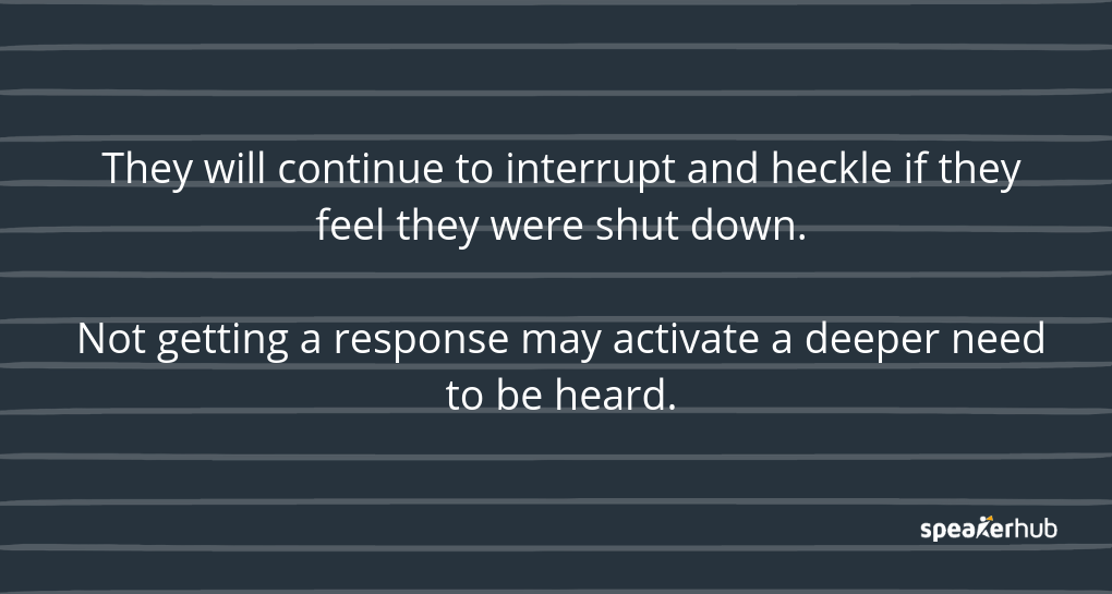 They will continue to interrupt and heckle if they feel they were shut down. Not getting a response may activate a deeper need to be heard.