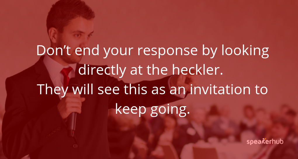 Top tip: don’t end your response by looking directly at the heckler. They will see this as an invitation to keep going. Look at a person on the other side of the room as you conclude your response. Then, jump directly back into your presentation.
