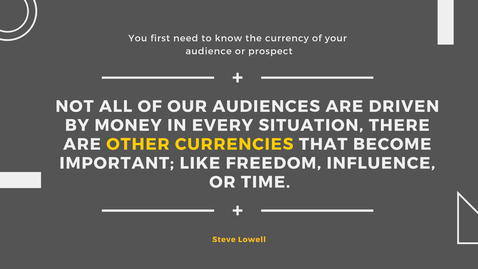 To accomplish this, you first need to know the currency of your audience or prospect. Not all of our audiences are driven by money in every situation. There are other currencies that become important: freedom, influence, time, etc.